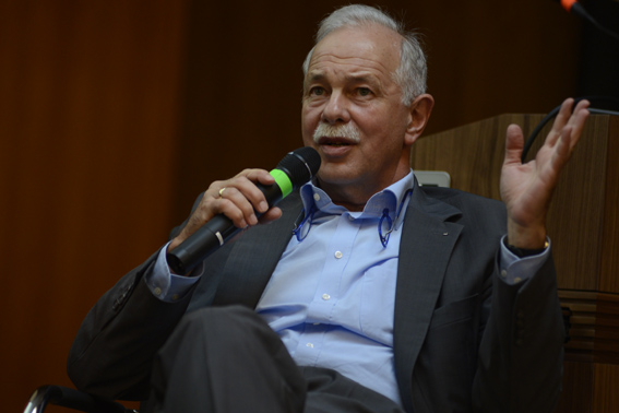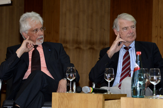 In der Herzkammer der deutschen Forschung: Am 6. Mai 2013 diskutierten Wissenschaftler und Wissenschaftsmanager an der Goethe-Universität Frankfurt über das Zusammenspiel von Universitäten und der außeruniversitären Forschung im deutschen Wissenschaftssystem. Beim Auftakt zur neuen Veranstaltungsreihe Helmholtz&Uni auf dem Campus Westend saßen Prof. Dr. Stefanie Dimmeler von der Universitätsklinik Frankfurt, Prof. Dr. Jürgen Mlynek, Präsident der Helmholtz-Gemeinschaft, Prof. Dr. Werner Müller-Esterl, Präsident der Goethe-Universität Frankfurt und Prof. Dr. Wolf Singer vom Max Planck Institute for Brain Research - Ernst Strüngmann Institute (ESI) for Neuroscience in Cooperation with Max Planck Society auf dem Podum.