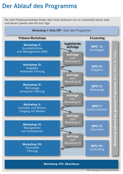 Über die E-Learning-Plattform bereiten sich die Teilnehmerinnen und Teilnehmer des Nachwuchsführungskräfteprogramms auf die Präsenzworkshops vor. In insgesamt 20 Management Praxis Online Modulen (MPO) werden die Grundsätze, Aufgaben und Werkzeuge wirksamen Managements sowie die Themen Kommunikation, Unternehmensstrategie und finanzielle Führung ausführlich behandelt.