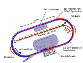 - Draufsicht auf den in Konstruktion befindlichen HESR Speicherring bei GSI-FAIR. ACID wird ent-scheidende Teile für den Elektronenkühler liefern, der für die Hochluminositäts-experimente mit Antiprotonen an FAIR/PANDA benötigt wird. Auch ist ACID die treibende Kraft für einen möglichen Ausbau des HESR zu einem Elektron Nukleon Kollider (ENC@FAIR): normalleitende Kavitäten bilden einen 3.3 (2*1.65) GeV Linac, von dem aus spinpolarisierte Elektronenpulse in einen Elekt-ronenspeicherring im HESR-Tunnel eingeschossen werden – diese Komponenten müssen zusätzlich entwickelt werden. In PANDA werden die Strahlen unter einem Kreuzungswinkel zur Kollision gebracht, wobei supraleitende CRAB-Kavitäten zum Einsatz kommen, die ebenfalls von ACID entwickelt werden können. Aufgrund des Vorhandenseins von HESR Speicherring und PANDA Detektor ist der ENC@FAIR wahrscheinlich ein sehr ökonomischer Ansatz zur Reali-sierung eines Elektron/Nukleon Kolliders.