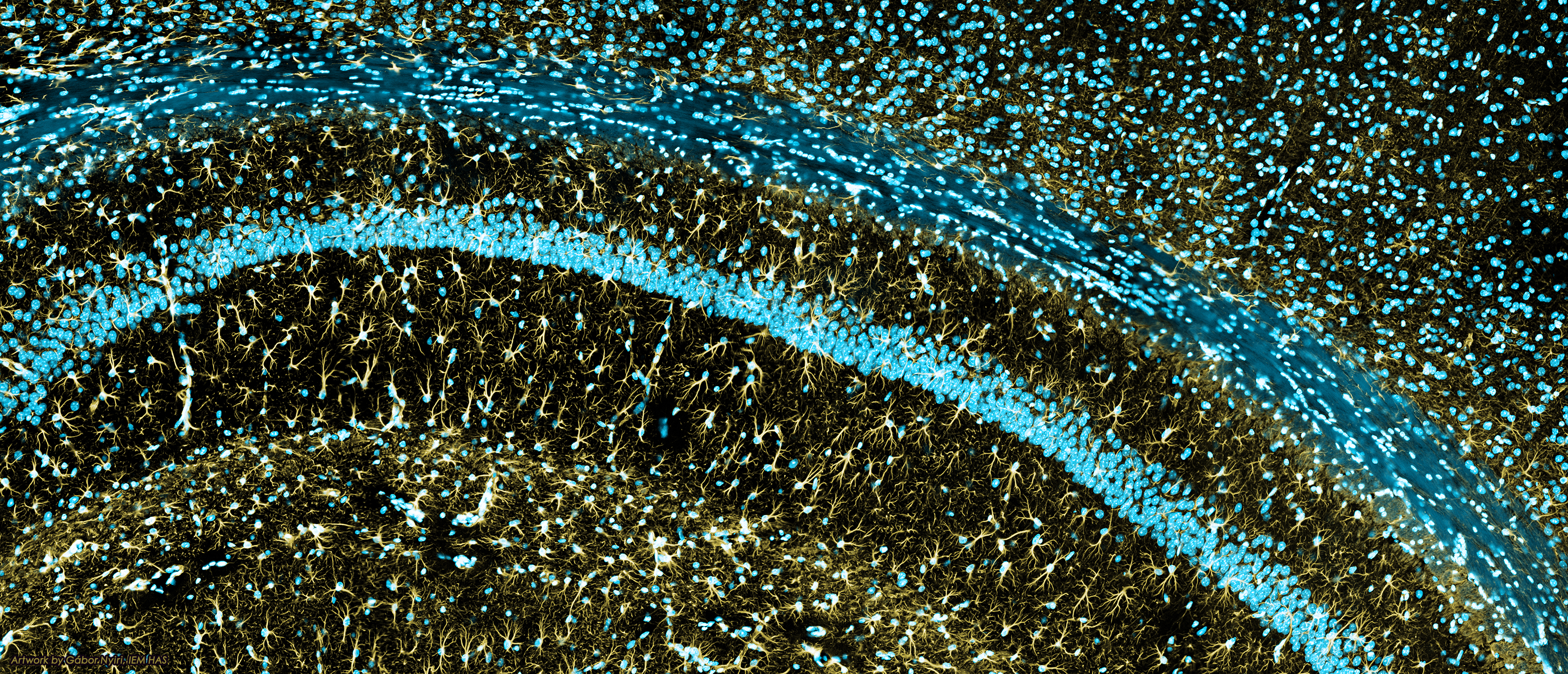 Teilbereich von Hippocampus und Neocortex mit fluorezierenden Zellkernen (blau) und Gliazellen (gelb). Bild: Ungarische Akademie der Wissenschaften, Gabor Nyiri, IEM HAS (CC-BY-NC-SA)