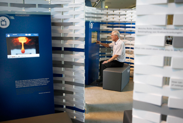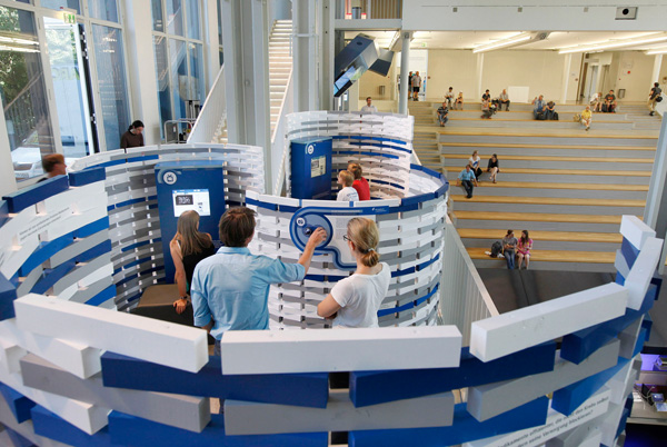 Ein weiterer Baustein des Moduls ist die Mediathek. In Sitzecken können die Besucher Bilder, Filme oder interessante Audiobeiträge aus der Helmholtz-Forschung abrufen, von der Umweltforschung über aktuelle Fragen der Gesundheit bis zur Werkstoffentwicklung und Elementarteilchenphysik. Die Aufnahmen aus der Forschung stammen aus den 18 Helmholtz-Zentren.
