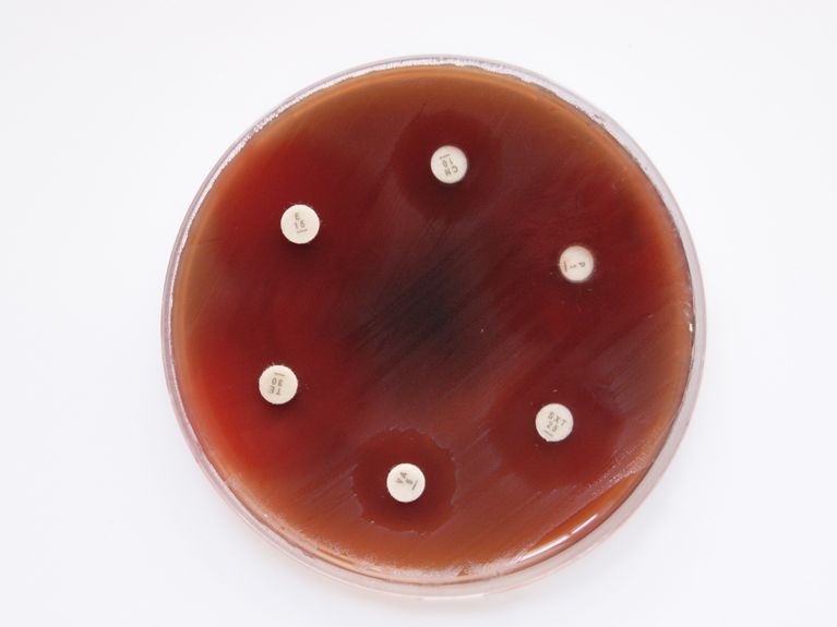 Das Bild zeigt einen Hemmhoftest, mit dem überprüft wird, ob Bakterien gegen bestimmte Antibiotika resistent sind. Bild: HZI/René Bergmann, Patric Nitsche-Schmitz