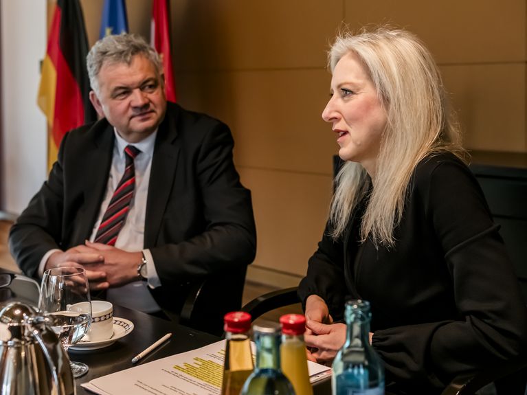 Sebastian Schmidt und Franziska Broer sprechen in der Rieslingstube der Hessischen Landesvertretung in Berlin über 30 Jahre Helmholtz-Gemeinschaft. Bild: David Marschalsky