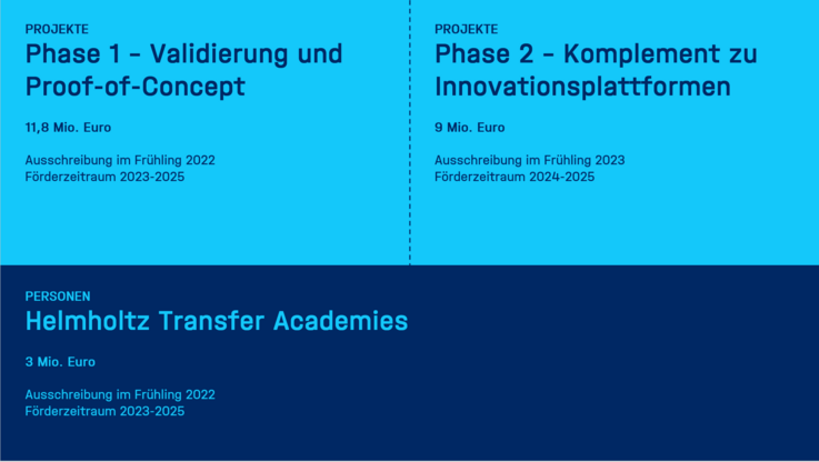Die Förderinstrumente unserer Kampagne richten sich dabei sowohl an Projekte der Zentren als auch an Personen: In zwei Phasen werden wir einen Großteil der Mittel auf Transferprojekte verwenden. Dabei zielt Phase 1 darauf ab, themenunabhängig Projekte zu identifizieren und zu fördern, die ein hohes Transferpotenzial haben, also die herausfordernden „letzten Meter“ zwischen Labor und wirtschaftlicher Verwertungsreife zu unterstützen (zur Ausschreibung). Phase 2 (ab 2023) dient dazu, Ermöglichungsräume und Strukturen für Ausgründungen zu schaffen, als Schnittstellen zwischen Industrieforschung und außeruniversitärer Forschung. Diese Strukturen sind eine Weiterentwicklung der „Helmholtz Innovation Labs“.