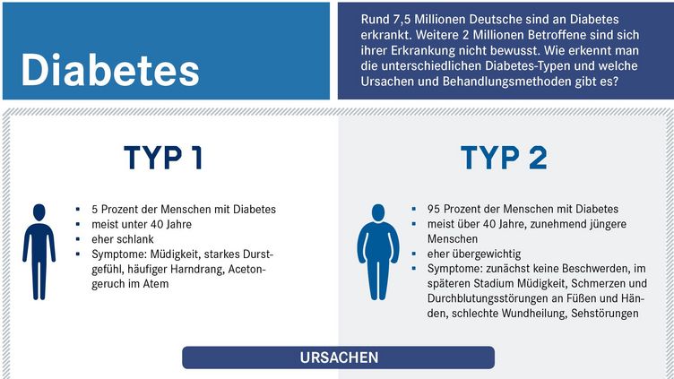 Rund 7,5 Millionen Deutsche sind am Diabetes erkrankt. Weitere 2 Millionen Betroffene sind sich ihrer Erkrankung nicht bewusst. Wie erkennt man die unterschiedlichen Diabetes-Typen und welche Ursachen und Behandlungsmethoden gibt es?